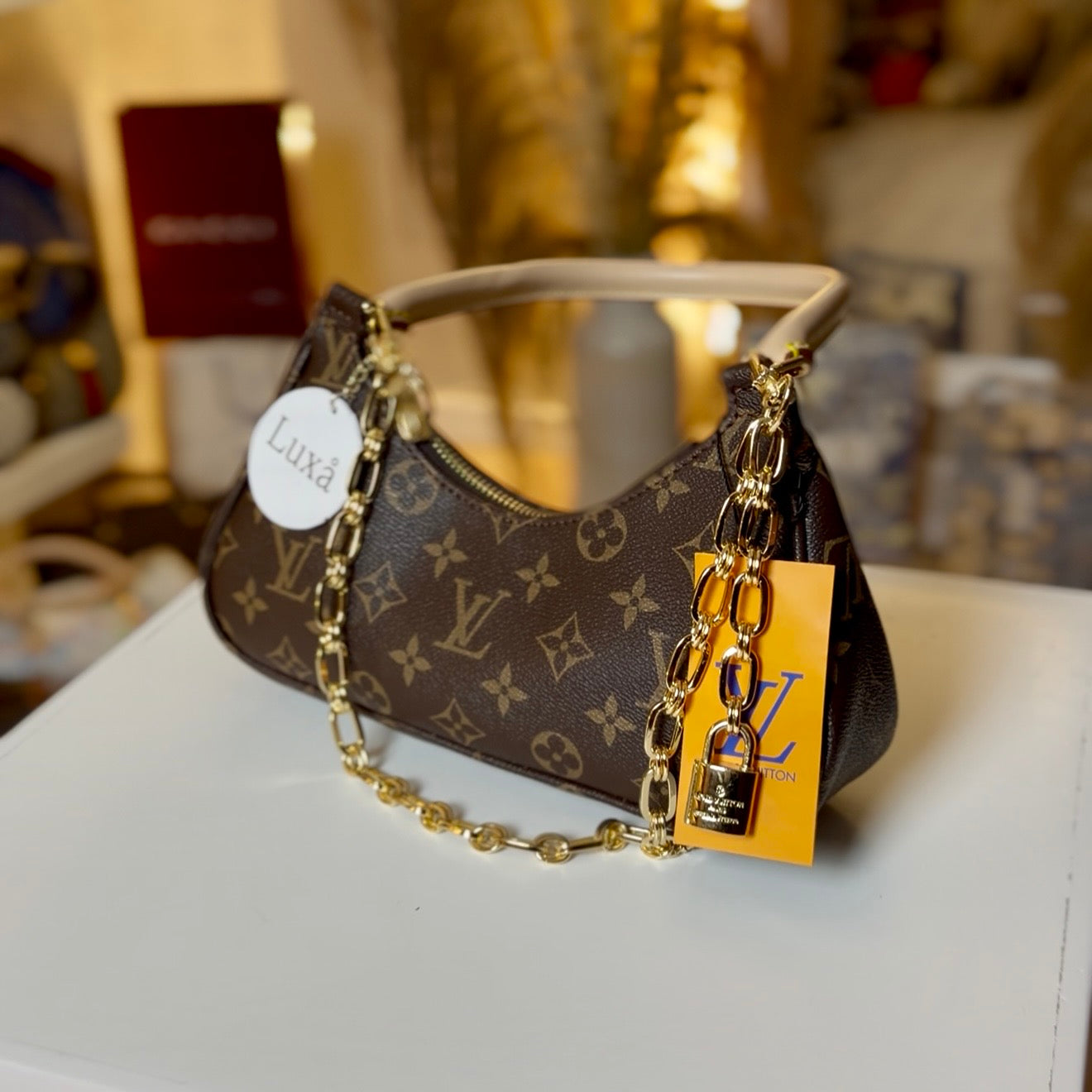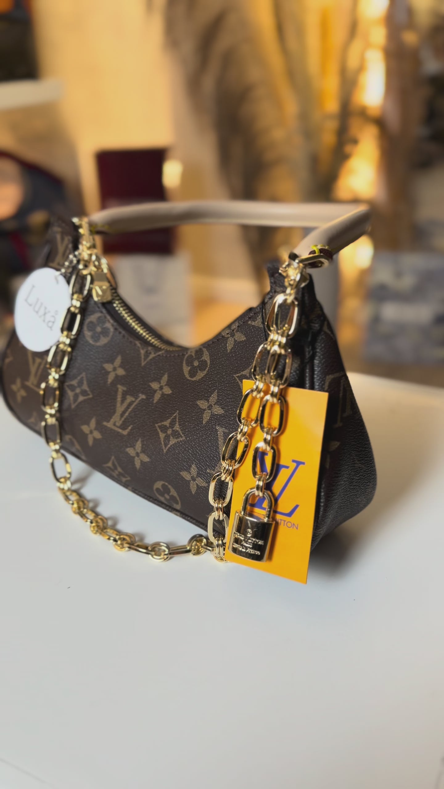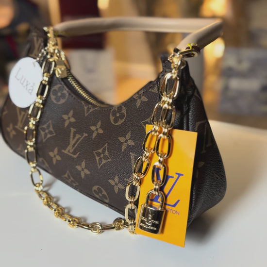 Διαθέτει μια αναδιπλούμενη δερμάτινη λαβή για μεταφορά στο χέρι ή στον ώμο, καθώς και μια διακοσμητική χρυσή αλυσίδα.